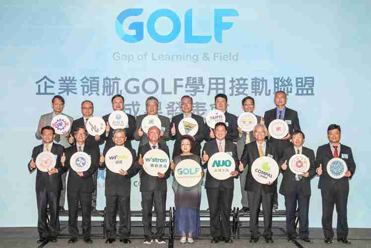 GOLF学用接轨联盟集结企业和学校的力量,,打造「学用合一、、、产学接轨」的创新合作平台 (前排左起:淡江大学副校长何启东、、、元智大学校长林启瑞、、、纬育执行长许延岳、、、纬创总经理暨执行长黄柏漙、、教育部政务次长范巽绿、、PG国际董事长暨执行长彭双浪、、、、仁宝总经理暨执行长翁宗斌、、、大同大学校长何明果、、、圣约翰科大校长艾和昌;后排左起:明新科大校长林启瑞、、龙华科大校长葛自祥、、、、台湾科大校长廖庆荣、、、中兴大学副校长郑政峯、、中央大学校长周景扬、、、台北科大副校长任贻均、、中华科大副校长石大明、、、明志科大校长刘祖华)
